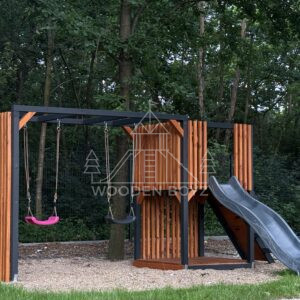 | Wyposażenie standardowe | Otwarta piaskownica Wieża z wejściem po ścianko-schodkach Zjeżdżalnia o długości 2,5m z możliwością podłączenia wody Dwie huśtawki (na każdym stanowisku do wyboru kubełkowa lub deseczka) Kotwy w zestawie – dla maksymalnej stabilności konstrukcji Impregnaty i akcesoria – szeroka paleta kolorów do wyboru |