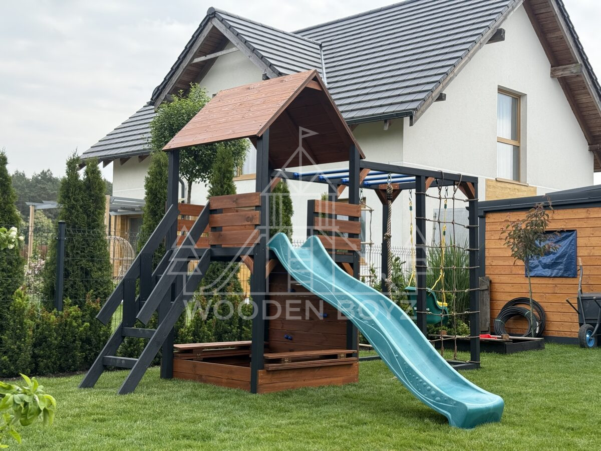| Wyposażenie standardowe | Otwarta piaskownica Wieża ze ścianką wspinaczkową – do wysokości podestu Schody Huśtawka – do wyboru kubełek dla najmłodszych lub plastikowa deseczka Zjeżdżalnia o długości 2,5m z możliwością podłączenia wody Siatka do wspinaczki Drążek do akrobacji Lina i drabinka do wariacji Impregnaty i akcesoria – szeroka paleta kolorów do wyboru |
