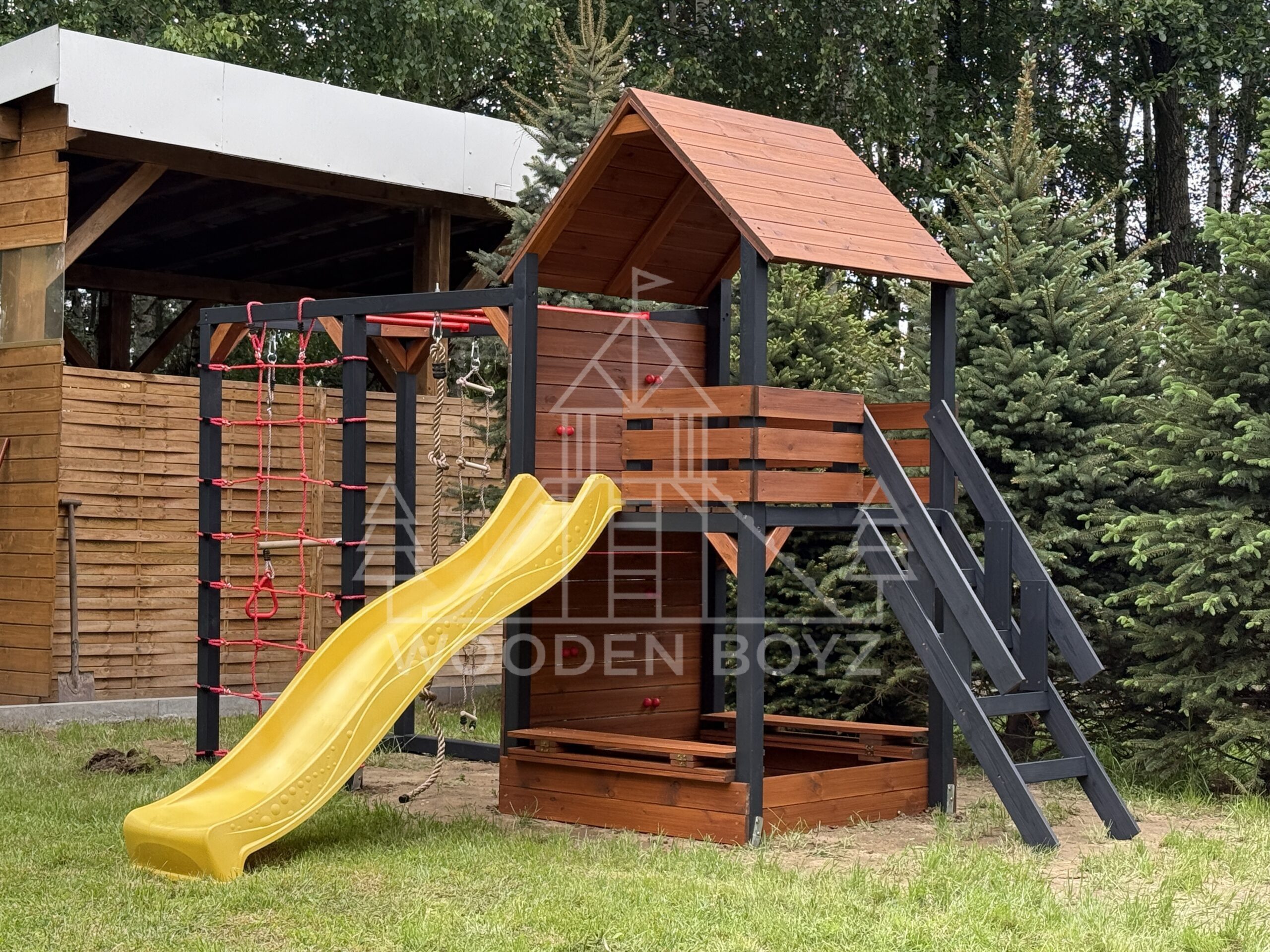 | Wyposażenie standardowe | Otwarta piaskownica Wieża ze ścianką wspinaczkową – do wysokości podestu Schody Huśtawka – do wyboru kubełek dla najmłodszych lub plastikowa deseczka Zjeżdżalnia o długości 2,5m z możliwością podłączenia wody Siatka do wspinaczki Drążek do akrobacji Lina i drabinka do wariacji Impregnaty i akcesoria – szeroka paleta kolorów do wyboru |